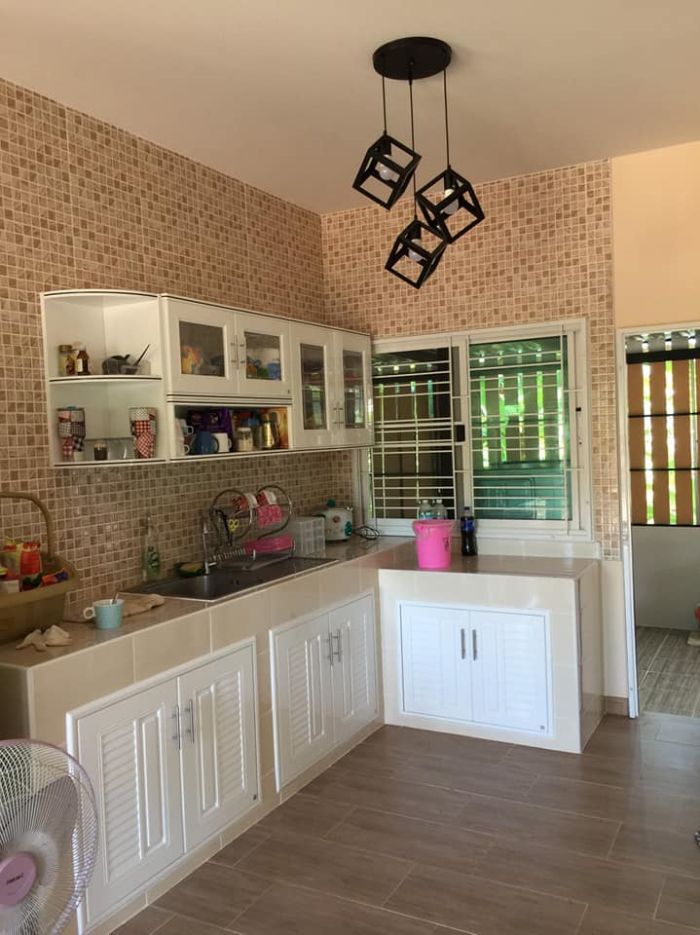 The kitchen looks neat and tidy and the beige color of the tiles just looks fine and matches the flooring tiles.