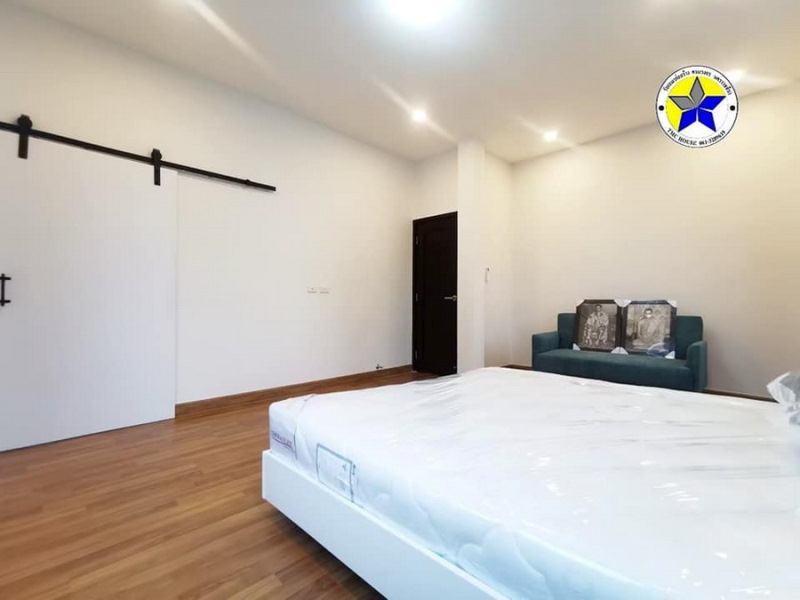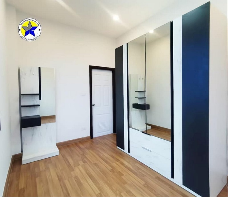 The space is a reflection of how the living room looks. It utilizes similar paint colors, except in the flooring where wood tiles were used in the bedroom.