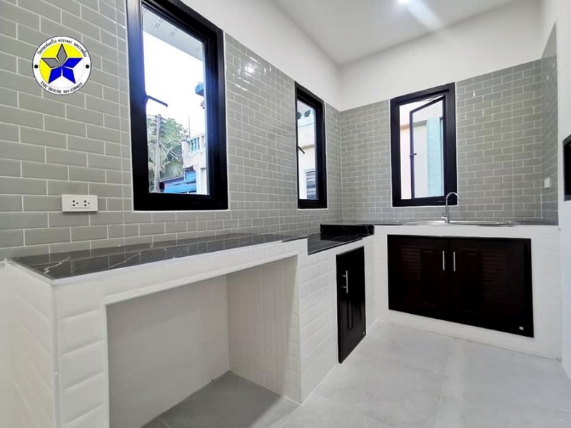 Meanwhile, the kitchen looks very modern with light grey floor tiles, cream countertops, brown cabinets, and grey colored wall brick tiles.